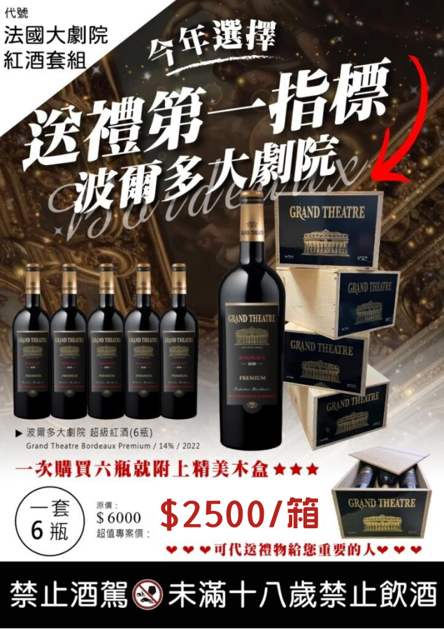 🔥新品推薦|法國大劇院波爾多紅酒 🇫🇷 波爾多AOC法定產區 精緻典雅酒標、香氣層次豐富,常溫微醒即可入口。送禮大方、自用更划算! 💰優惠價 $500/瓶 💰成箱優惠 $2500/六瓶 (原廠木箱) ✨成箱享免常溫運費 🍷Grand Theatre Bordeaux Premium 2022 酒精濃度:14% Cabernet Franc25%、Merlot25%、Cabernet Sauvignon25%、Malbec25% 風味描述:成熟紅色水果、黑醋栗香氣、柔順單寧、尾韻優雅 貼心提醒😘❣️ 酒後不開車🚫🚘 未成年請勿飲酒🔞