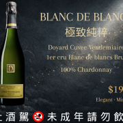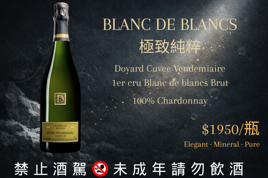 BLANC DE BLANCS|極致純粹登場 ✨香檳王、水晶香檳慕後功臣 Doyard創立於1677年,產量極少,因為70%葡萄供應給許多頂級香檳酒莊 來自香檳區最純淨優雅的產區-白丘(Côte des Blancs),生產許多頂級白中白香檳 🍾Doyard Cuvée Vendémiaire 1er Cru Blanc de Blancs Brut NV 🔸100% Chardonnay打造最純粹的香檳風格 🔸歷經48個月以上長時間瓶中熟成 展現細緻氣泡與層次豐富的風味 白花、青蘋果、杏仁與礦物氣息交織 口感俐落、酸度明亮,尾韻優雅細緻 💰優惠價$1950/瓶 貼心提醒😘❣️ 酒後不開車🚫🚘 未成年請勿飲酒🔞